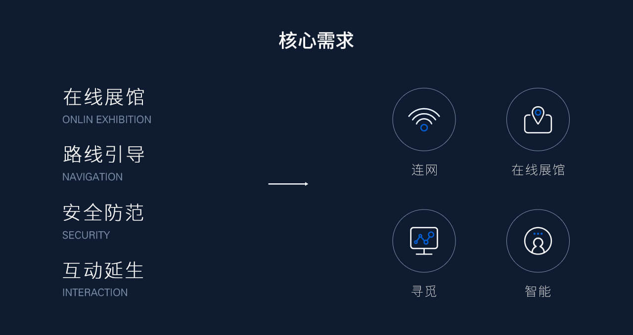 设计目标“数据可视化”、“联网”、“展馆内的定位导航”是该项目的需求难点。通过之前的用户和场景分析,以及对细分需求的深度挖掘,我们提炼了几个关键点作为我们的设计目标:“1.以用户为中心”、“2.智能化便捷操作”、“3.信息层级清晰”、“4.场景化设计”、“5.工具属性与平台属性的平衡”、“6.优美展示数据”。围绕设计目标我们以提升产品的易用性和美观性为重点,运用创新的设计思路,进行交互与视觉设计,努力做到使界面信息更清晰、风格更简洁、使用更方便,并且通过多次用户可用性测试和专家评估方法,不断检视和完善设计细节,从而全面提升用户的操作体验。 |