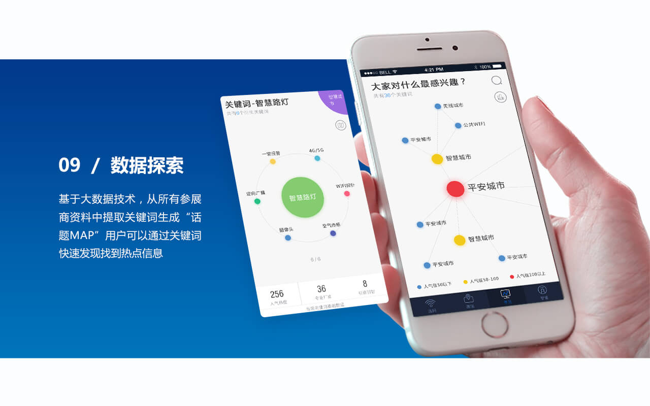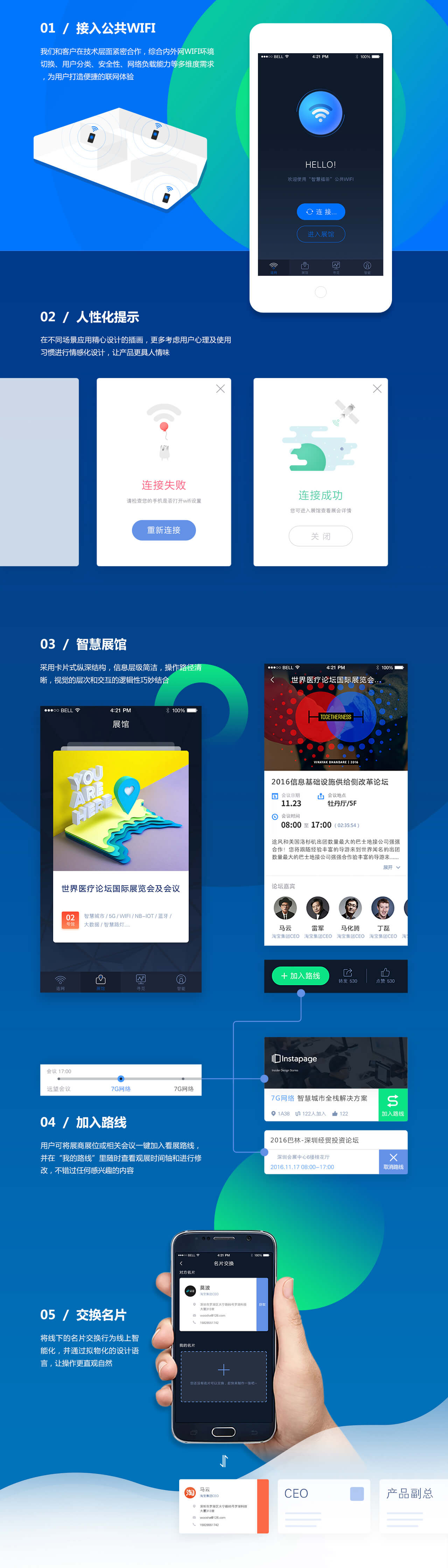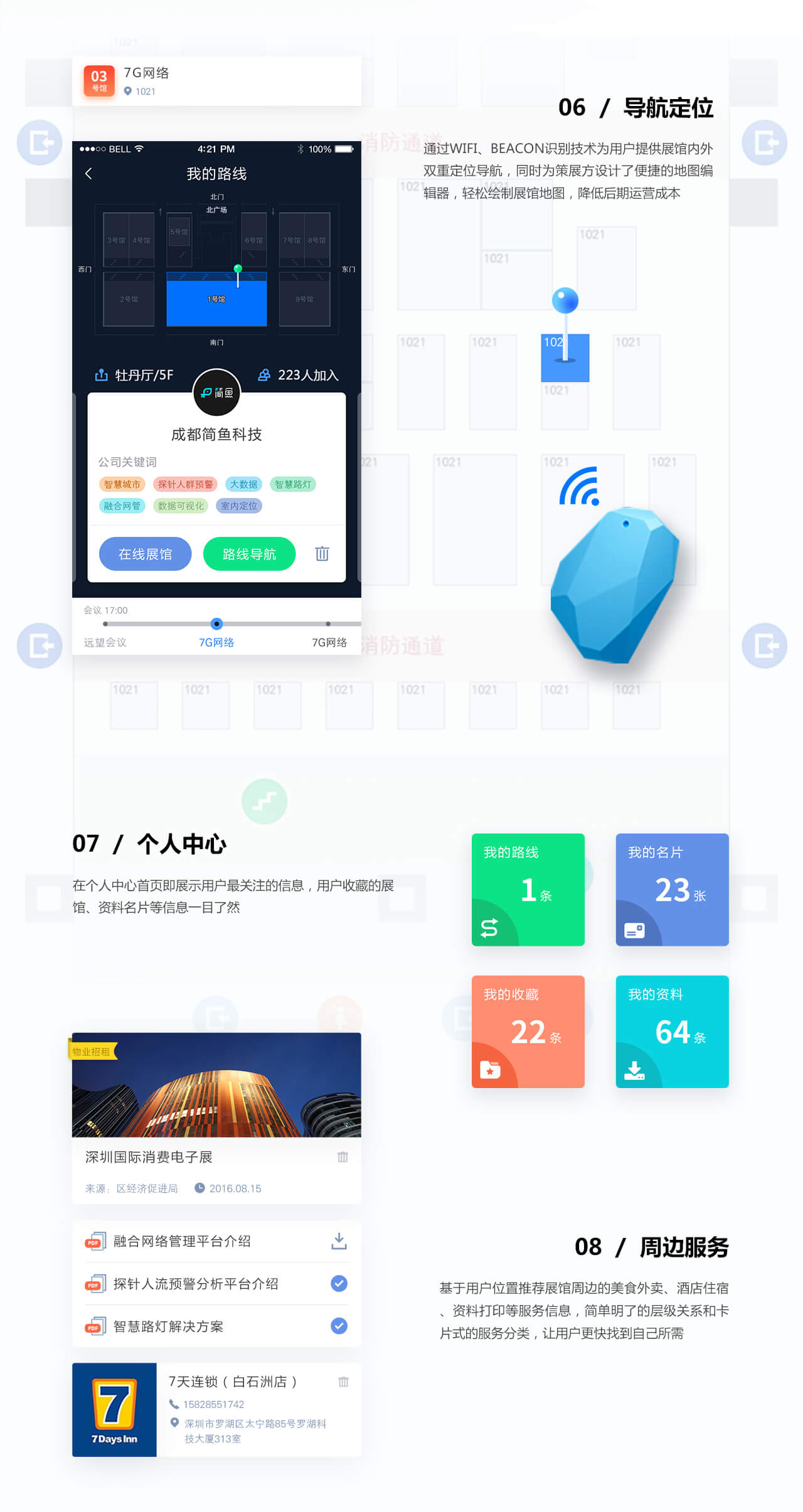 项目背景会展的核心在于“展示销售”,会展业必须紧跟时代步伐,逐步实现行业管理的现代化、会展设备的智能化和活动组织的网络化,推动会展业的品牌化、专业化和可持续性发展。7G网络作为国内领先的公共WiFi和智慧路灯领域全栈综合解决方案提供商及感知大数据整合应用专业提供商,希望通过自身在公共WiFi建设与融合管理、智慧城市建设、以及大数据服务等方面的长期经验积淀,结合我们简鱼科技在云计算、大数据、移动互联网整体解决方案设计等方面的综合能力,设计开发一款集展会服务(预约、洽谈、交流、导航等)、公共WIFI提供、周边服务于一体的“数字化会展”移动应用服务平台(包括app端以及后台管理),并以此为契机打通智慧会展生态系统。 |