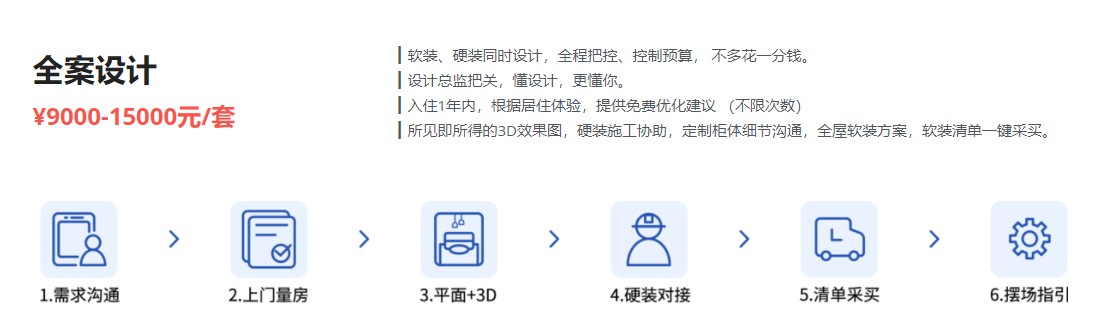 ▎软装、硬装同时设计,全程把控、控制预算, 不多花一分钱。 ▎设计总监把关,懂设计,更懂你。 ▎入住1年内,根据居住体验,提供免费优化建议 (不限次数) ▎所见即所得的3D效果图,硬装施工协助,定制柜体细节沟通,全屋软装方案,软装清单一键采买。