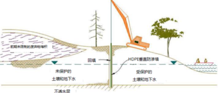 根据水文地质特征,利用基础下方存在的独立水文地质单元、不透水或弱透水层等,在填埋场一边或周围设置垂直