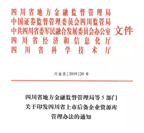 近日,四川省地方金融监督管理局、中国证券监督管理委员会四川监管局、中共四川省委军民融合发展委员会办公室、四川省经济和信息化厅、四川省科技厅五部联合印发《四川省上市后被企业资源库管理办法》(以下简称《办法》)。